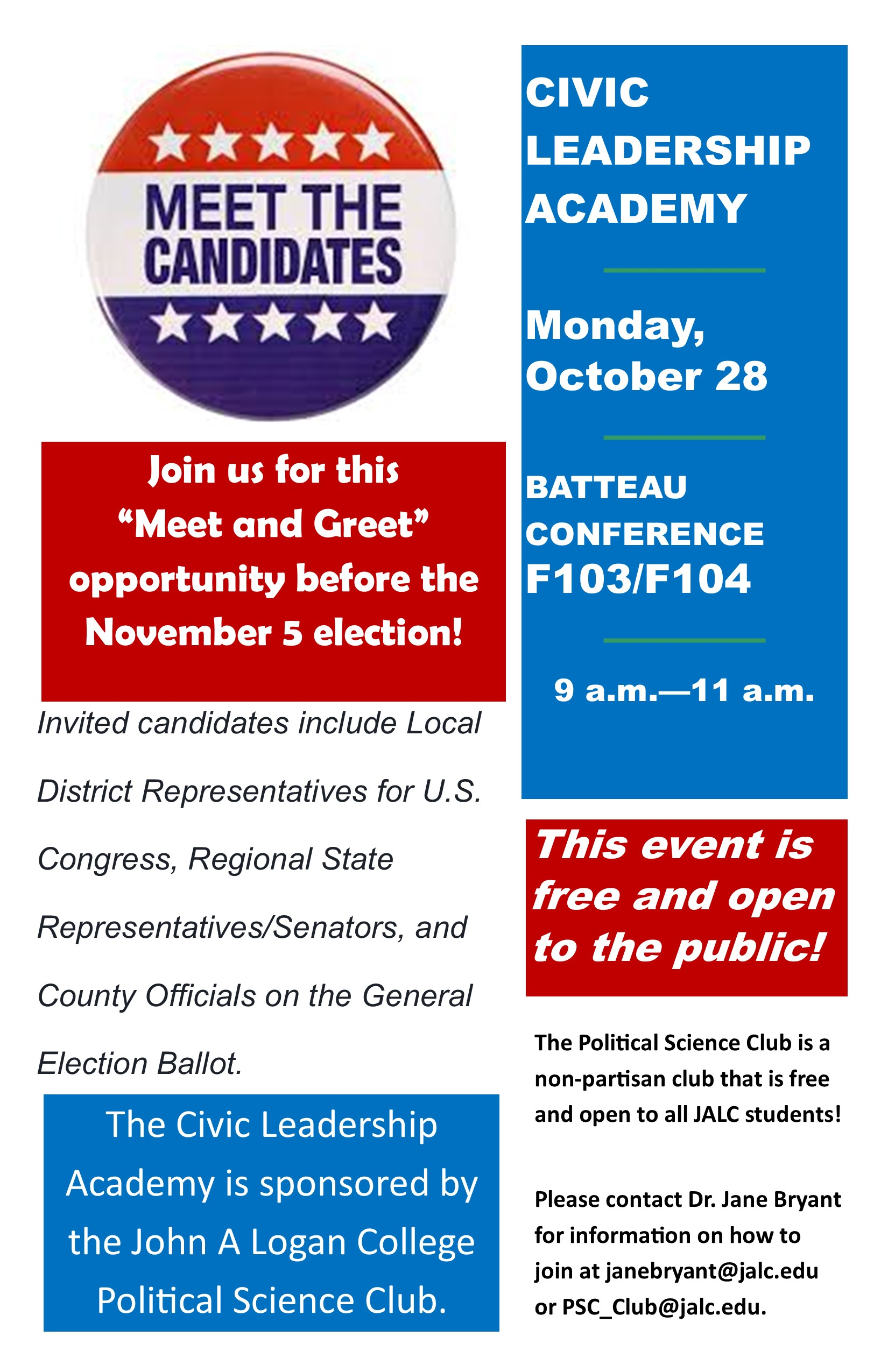The John A Logan Political Science Club is hosting a Meet & Greet, Monday, October 28th in the Batteau Conference Room F103/F104 from 9 a.m. - 11 a.m.